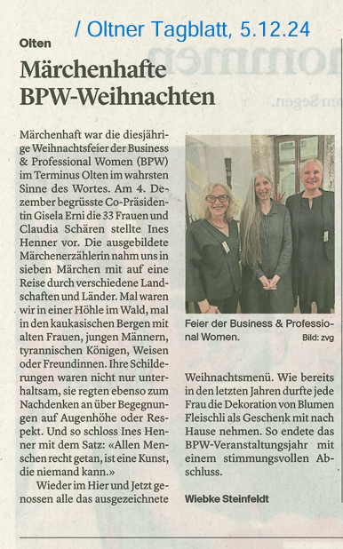 Auf der Weihnachtsfeier der Business & Professional Women (BPW) Olten ging es in ihren Märchen zum Teil um tolle Frauen. Ihre Schilderungen waren nicht nur unterhaltsam, sie regten ebenso zum Nachdenken an über Begegnungen auf Augenhöhe oder Respekt. Wunderbare Märchen voller Lebensweisheiten, die in uns noch lange nachklangen.